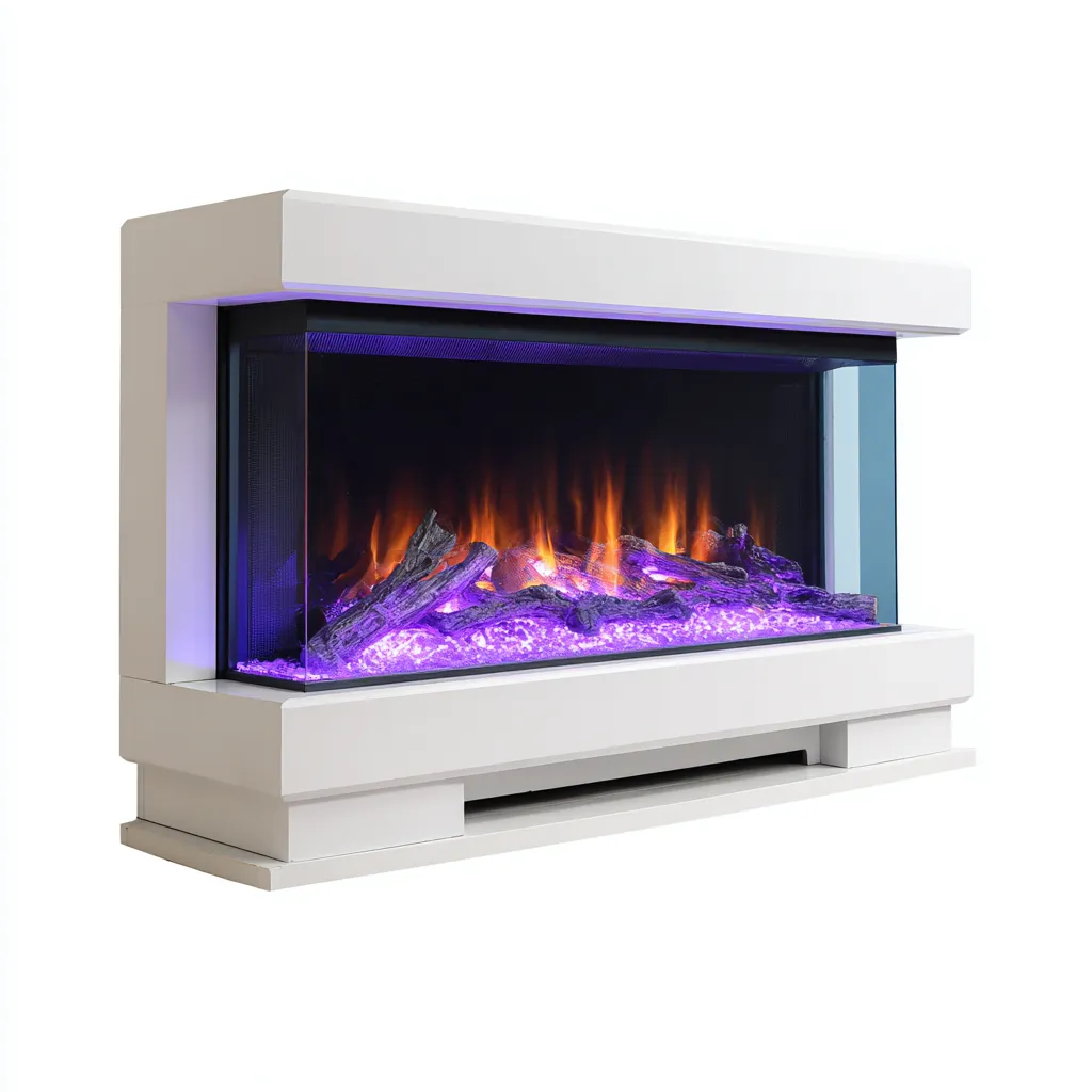 La structure est fabriquée en métal avec une finition blanche soignée, associée à une façade en verre transparent offrant une vue immersive sur l'effet flamme. L'ensemble est pensé pour une utilisation intérieure stable et durable.