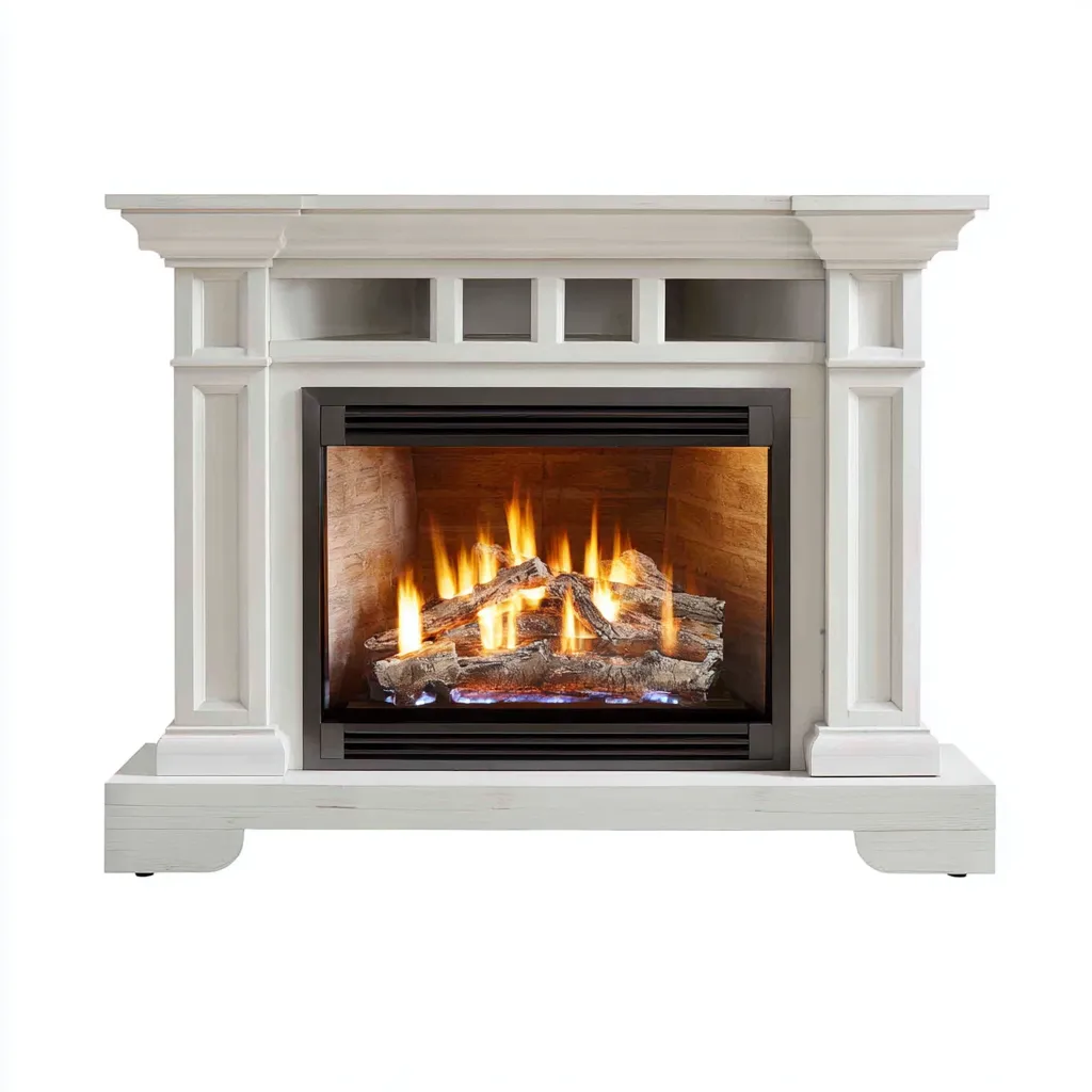 La structure extérieure est réalisée avec un manteau de couleur blanc cassé, à l'aspect bois peint. Le foyer électrique intégré est encadré d'une façade sombre qui met en valeur l'effet de flammes.