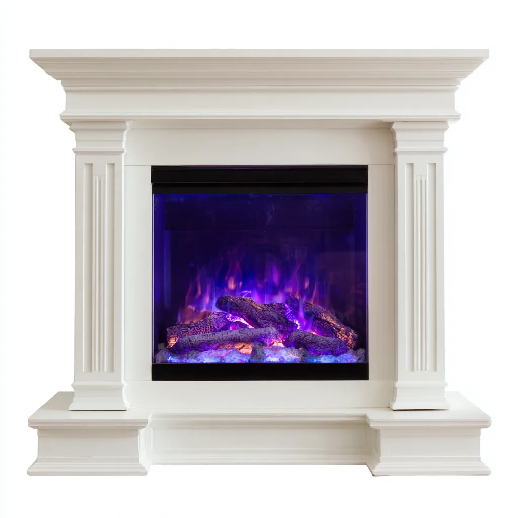 La structure extérieure est dotée d'un manteau de couleur blanc cassé, à l'aspect bois peint. Le foyer électrique intégré est encadré par une façade sombre, mettant en valeur l'effet lumineux des flammes.