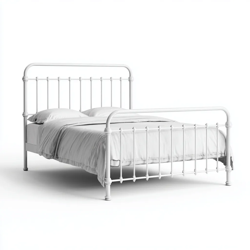 Le lit est fabriqué en métal avec une finition blanche uniforme. La surface est traitée pour offrir une bonne résistance à l'usage quotidien et une stabilité adaptée à un couchage double.